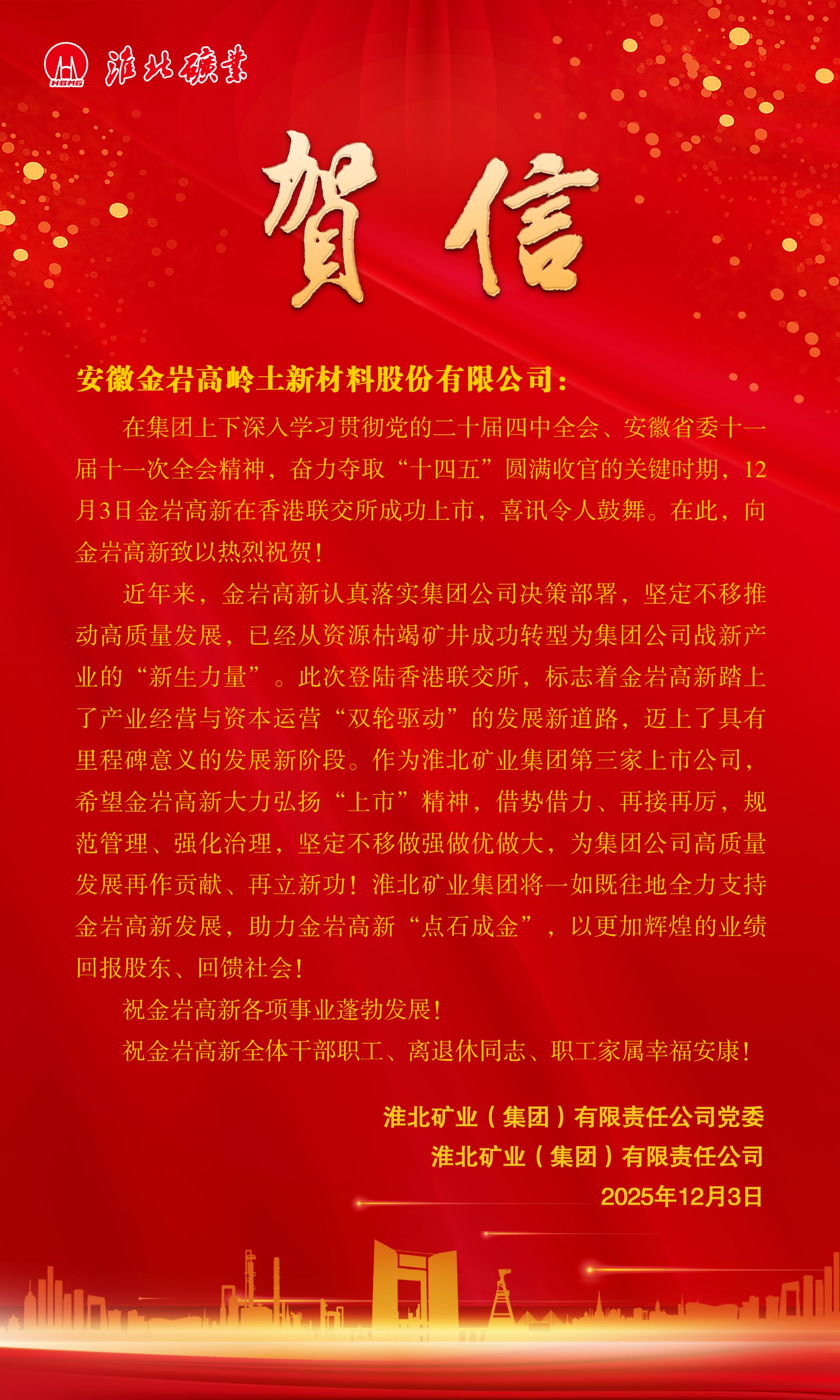 【贺信】淮北矿业集团给金岩高新上市的贺信